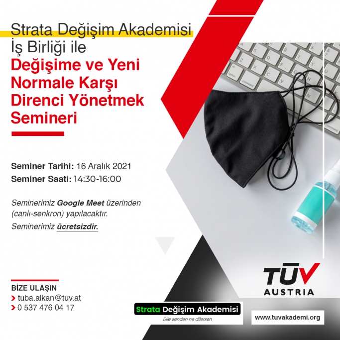 UND Akademi olarak 2017’den bugüne eğitim alanında güçlü bir işbirliği yürüttüğümüz TÜV AUSTRIA Akademi, Strata Değişim Akademisi ile birlikte 16 Aralık 2021 Perşembe günü saat 14:30-16:00 aralığında gerçekleştireceğimiz "Değişime ve Yeni Normale Karşı Direnci Yönetmek" seminerine davetlisiniz.