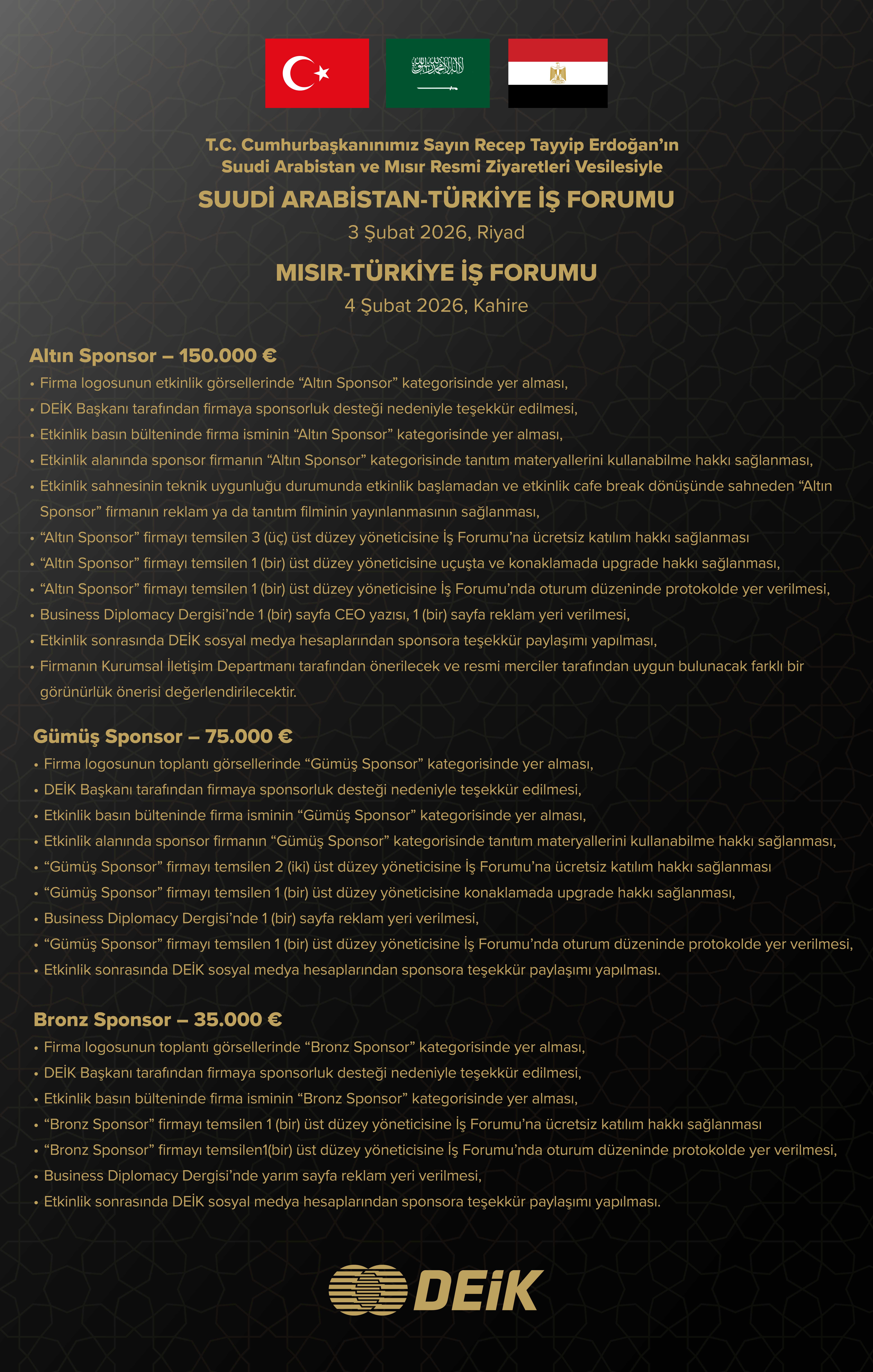 Cumhurbaşkanımız Sn. Recep Tayyip Erdoğan’ın 3-4 Şubat 2026 tarihlerinde Suudi Arabistan ve Mısır'a gerçekleştireceği resmî ziyaretleri vesilesiyle, iş dünyamızın üst düzey temsilcilerinin katılımlarıyla, ilgili ülkelerde 3 Şubat tarihinde Suudi Arabistan-Türkiye, 4 Şubat tarihinde ise Mısır-Türkiye İş Forumları gerçekleştirilecek olup, DEİK organizasyonunda özel uçak ile iş heyeti programı düzenlenecektir.